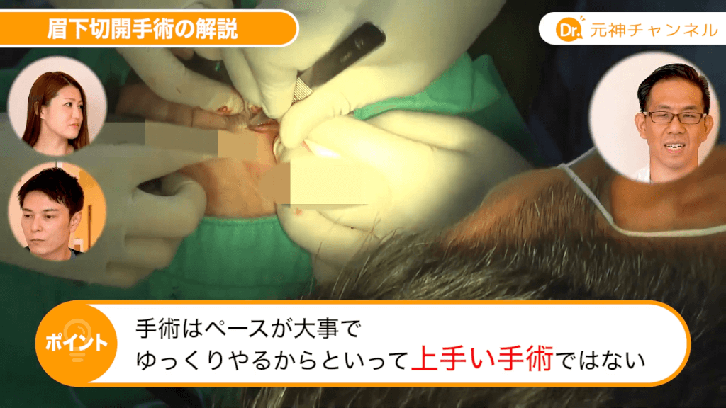 萩原:今回は元神先生の眉下切開・眉下リフト・ブロウリフトの手術動画を見ながら先生自身に解説をして頂く回でございます。高橋さん‼眉下切開は加齢による上まぶたのたるみで隠れた二重のラインをきれいに復活させる治療として人気も満足度も高い手術ですよね?