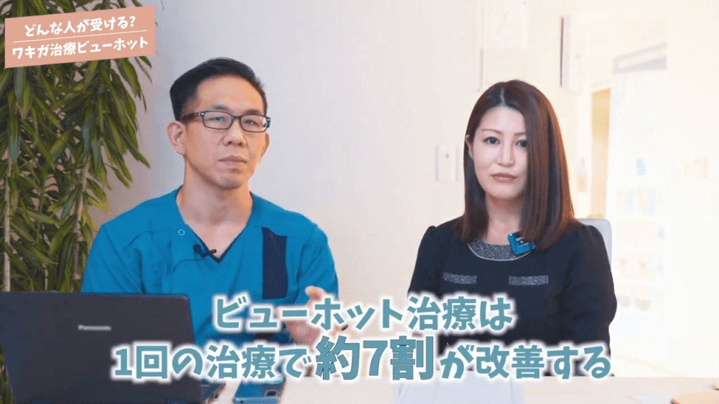 元神先生:ビューホット治療は1回の治療で大体7割くらいが改善すると安心ですね。100%は難しいんですけども。100%となると手術がいいんですけども、1回の治療では7割くらい改善するとお話ししています。