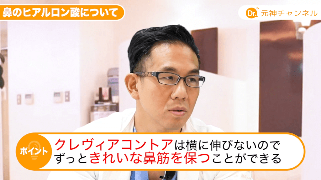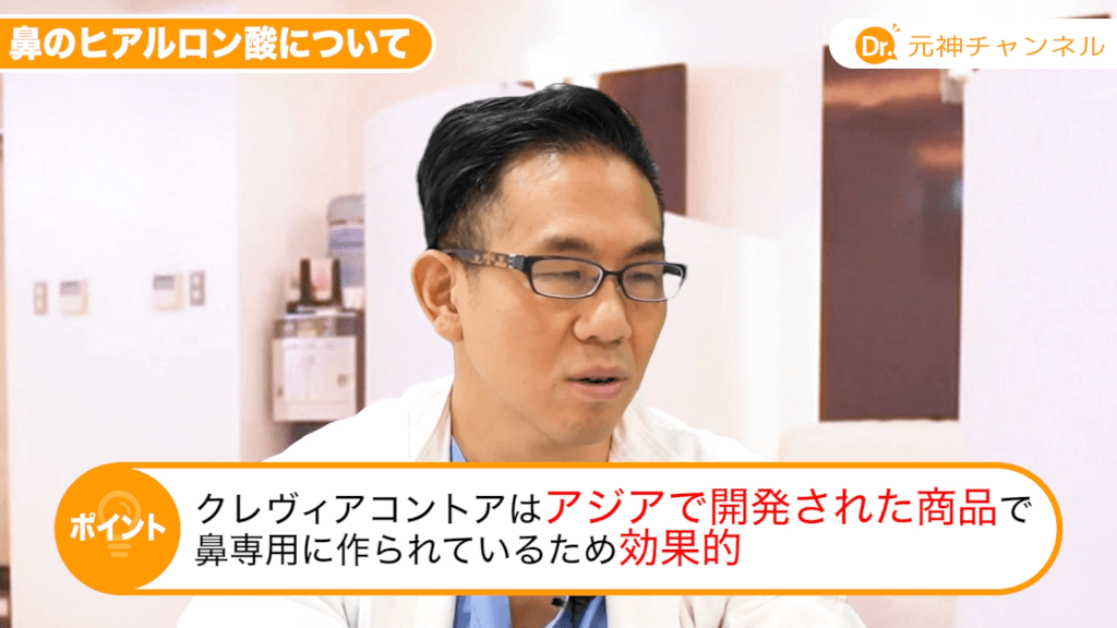 元神先生:ヒアルロン酸って元々ヨーロッパとかアメリカでたくさんいろんな新商品が開発されていたんですけど、欧米の方は鼻にヒアルロン酸を入れる事はまずないんですよ。みんなめちゃくちゃ鼻が高いじゃないですか。むしろ鼻を低くしたい手術の方が結構行われているくらいなので、鼻をあえて高くするというのはアジア人特有なんですよ。このクレヴィエルコントアに関してはアジアで開発された商品でして、鼻専用に一応作られていますので、なのでいいんですよね。