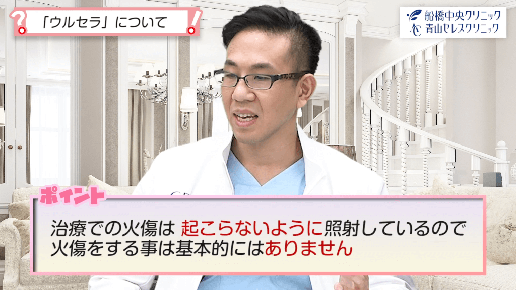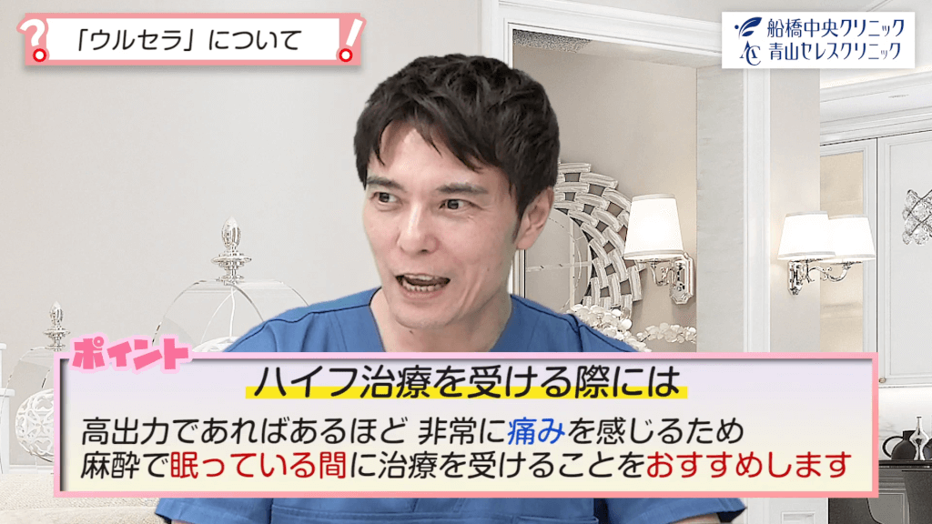元神先生:そうですね。ウルセラは非常にパワーが強い機械になりますので、そのまま最大限当てて麻酔をしないと滅茶苦茶痛くて耐えられないんですね。クリニックによっては色々な工夫を行っています。当院ではマスク麻酔と言いまして完全に寝ている間にウルセラを受けて頂きます。そうすることによって最大限のパワーで痛みもなく受けられるというのが特徴ですね。もう1点、パワーを強く当てて火傷が起こらないかというご質問ですけれども、これはそういうことが起こらないように当てていますので基本的にないと考えていただいて大丈夫です。