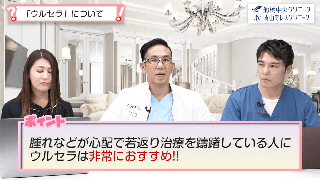 元神先生:ウルセラは照射する治療方法でして「効果が弱いんじゃないか」と思う方もいらっしゃるんですけれども、実際受けられますと非常に効果がご自身で分かります。それによってやはりリピーターさんが非常に多い治療になりますね。やはりウルセラを1回受けて良かったので半年・1年後に「また受けたい」という方が非常に多い人気の治療になりますね。ですので腫れとかが心配で若返り治療をためらっている方には非常におすすめの治療となります。