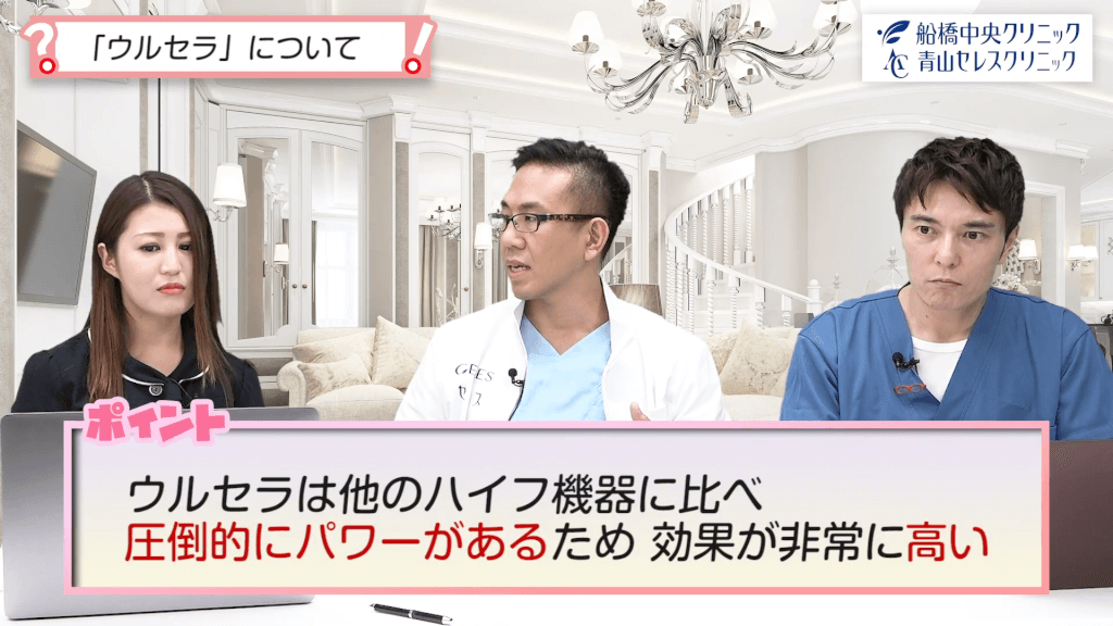 先生:ウルセラが圧倒的にパワーがあるんですね。他のハイフの機械と比べて全く(パワーが)違います。そこが1番重要なところですね。ですのでウルセラは非常に効果がありますね。