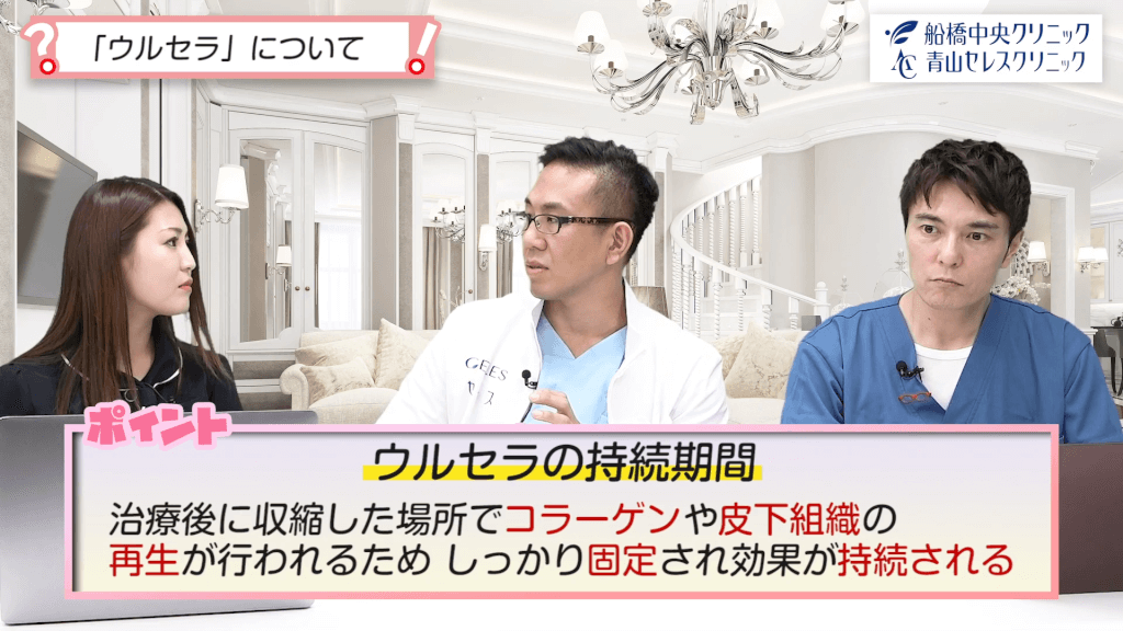 高橋:続いてのご質問です。「ウルセラを当てるとなぜ引き上がるのですか?またどれくらいの期間引き上がりますか?すぐに元に戻るのは勿体ないので長く持続してほしいです。」とのことですが、いかがでしょうか?