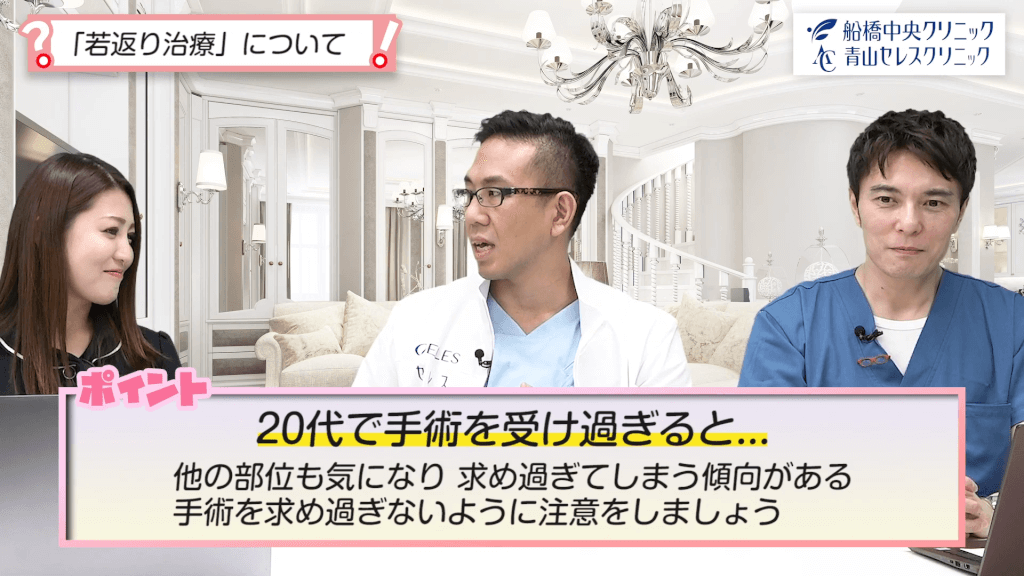 高橋:先ほどの司会のコメントのように28歳や20代後半から若返り治療を受けるというケースはあるんですか?その年齢から受けるメリットというのはあるんですか?