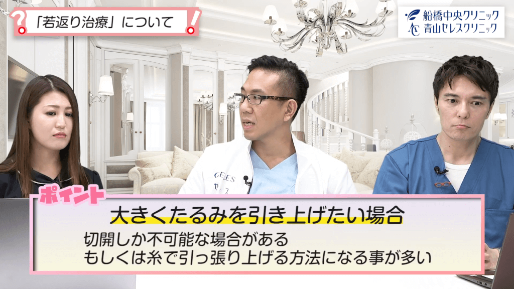 司会:今お話にありましたけれども、腫れや内出血が出ても構わないので「上げてくれ!」というご希望は今もあるんですね?フェイスリフトは昔の治療だと思っていたんですが。