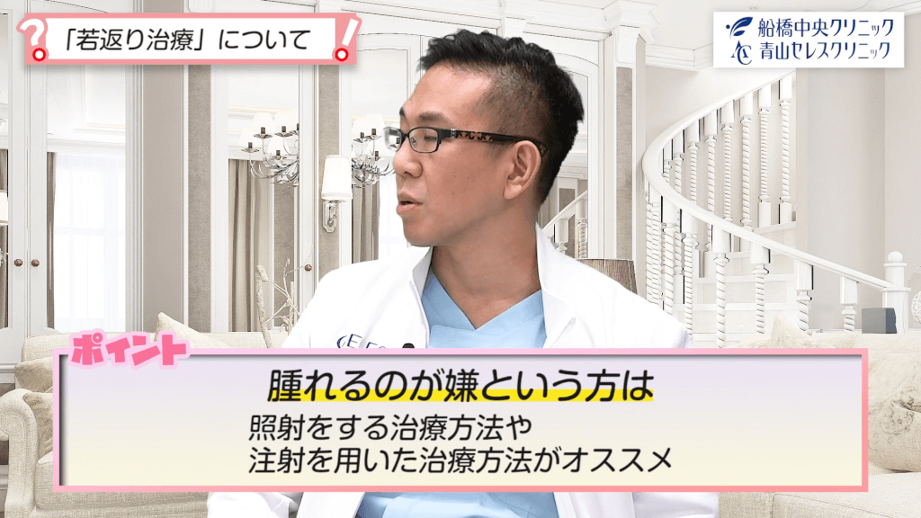 元神先生:ただそういった治療方法はやはり腫れますので、どうしても腫れを出したくないとかのご希望があれば照射するような方法だったり、注射を用いた若返り治療方法が良いと思いますね。