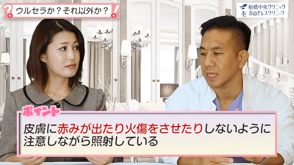 元神先生:一応承諾書の方にはまれに皮膚の赤みが出たり、軽い火傷が出る事は書いてるんですけれども、非常に注意しながらそういう事が起こらないように照射しています、それは。