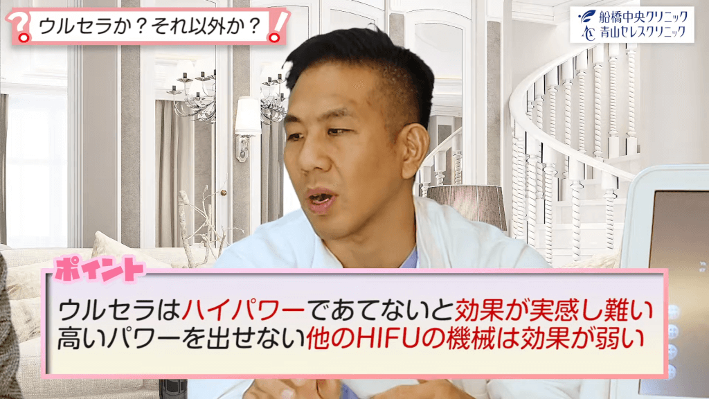 元神先生:ウルセラが一番最初なんですよ、実はHIFUの機械で。パワーが全然違うんですよね、他の機械と比べますと。ですのでウルセラの効果を出せるのはHIFUの中ではないですね。これは言い切れますね。