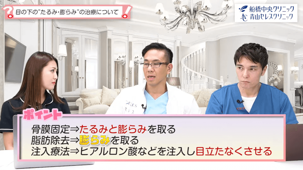 元神先生:目の下のたるみと膨らみに関して治療方法は様々あります。適用が非常に大事になってきます。どの治療方法を選ぶかの適用です。ですので診察したうえでベストな治療方法を提案させて頂きたいと思います。