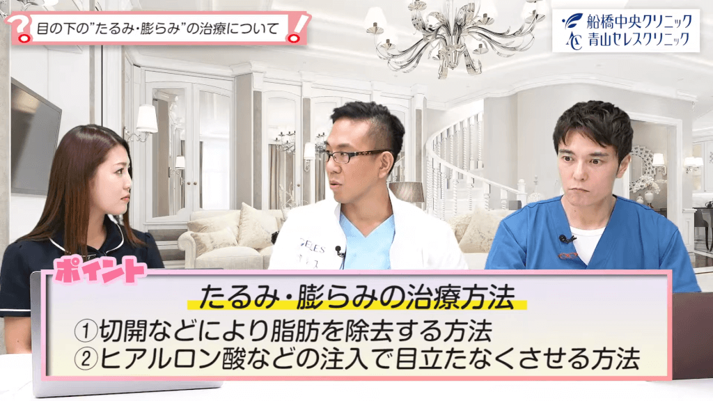 高橋:たるみや膨らみをなくす治療方法にはどんな方法がありますか?しっかり引き上げたい場合や周囲に分からない方法があるならそれも教えてください。