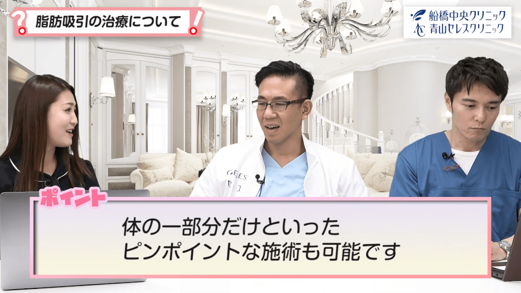 元神先生:できます!今のご質問のように腰の脂肪だけ脂肪したり、あとはウエストやおへそ周りだけとか、そういった要望は結構ありますね。あとは二の腕だけといったご相談も結構ありますね。
