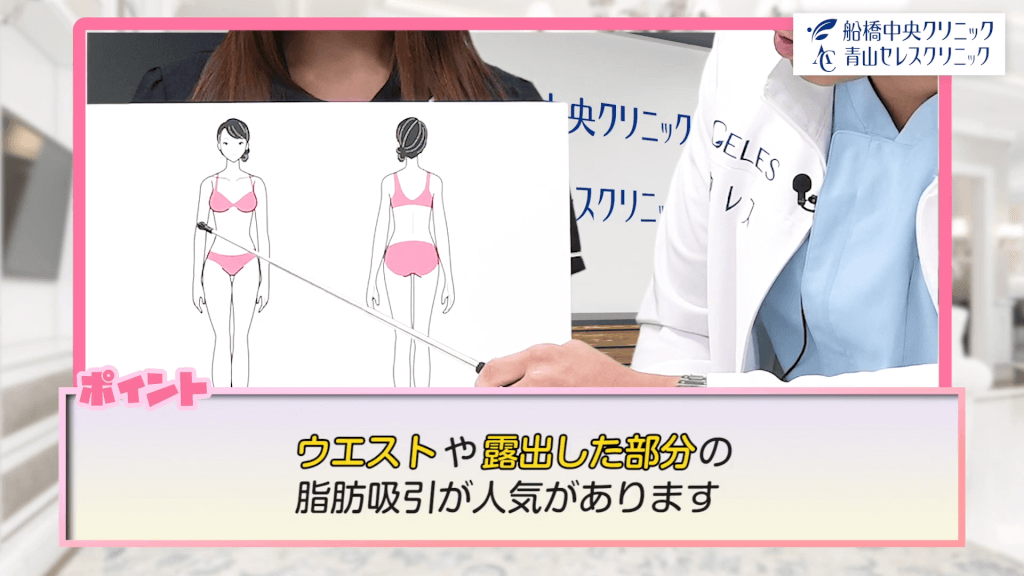 元神先生:脂肪吸引は全身できるんですけれども、特に人気の部位は腰のあたり、ウエスト部分ですね。背中側の腰、あとはウエストも人気ですね。あとは内ももであったり、二の腕とかふくらはぎ、露出するところは非常に人気がありますね。